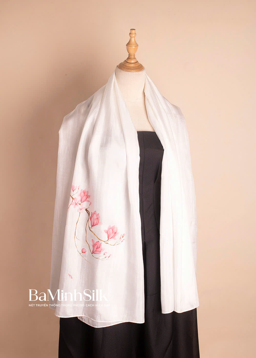 Khăn lụa tơ tằm vẽ tay họa tiết Hoa Mộc Lan của Bá Minh Silk được dệt thủ công từ làng lụa Nha Xá (Duy Tiên, Hà Nam). Làng nghề có truyền thống hơn 700 năm trong nghề dệt lụa tơ tằm. Sau đó, hoạ tiết khăn được họa sĩ vẽ tay tỉ mỉ, đảm bảo tính độc bản và thời trang.