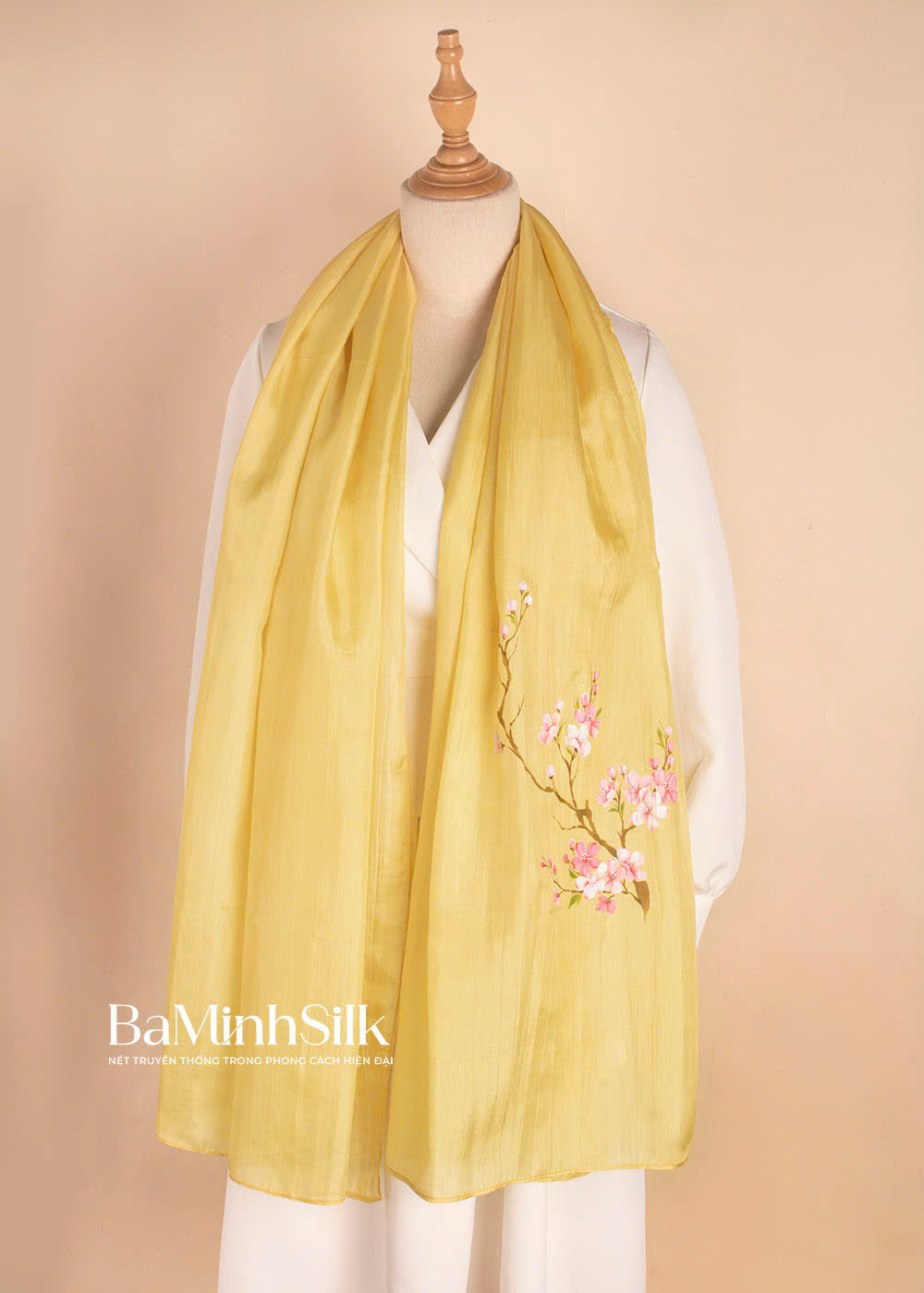 Khăn choàng lụa vẽ tay Hoa Tulip của Bá Minh Silk được dệt thủ công từ tơ tằm tự nhiên tại làng lụa Nha Xá (Duy Tiên, Hà Nam) – nơi có hơn 700 năm lịch sử dệt lụa. Sau đó, khăn được vẽ tay hoàn toàn bởi các họa sĩ Việt Nam. Tạo nên một tác phẩm nghệ thuật độc bản, mang vẻ đẹp vừa truyền thống vừa hiện đại.