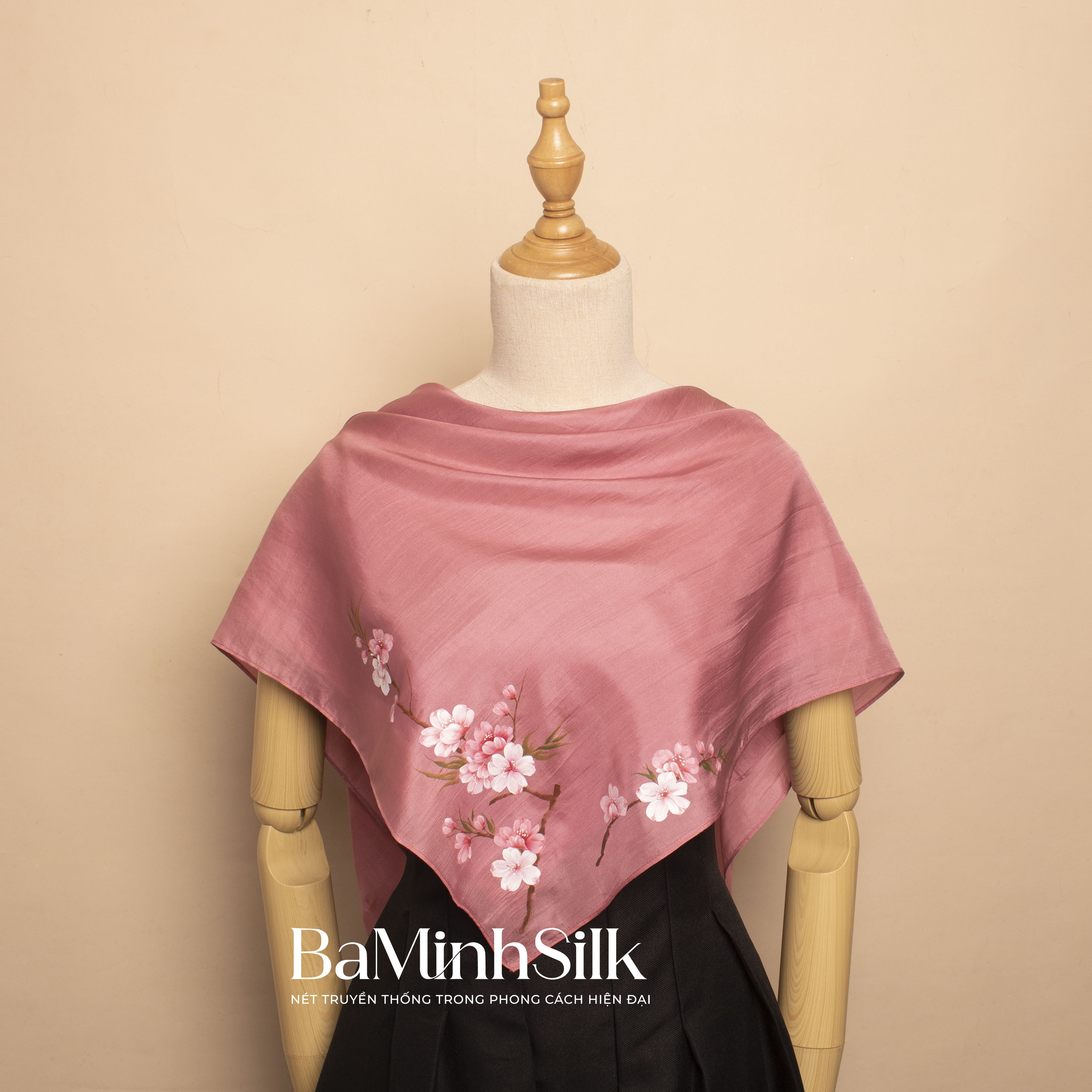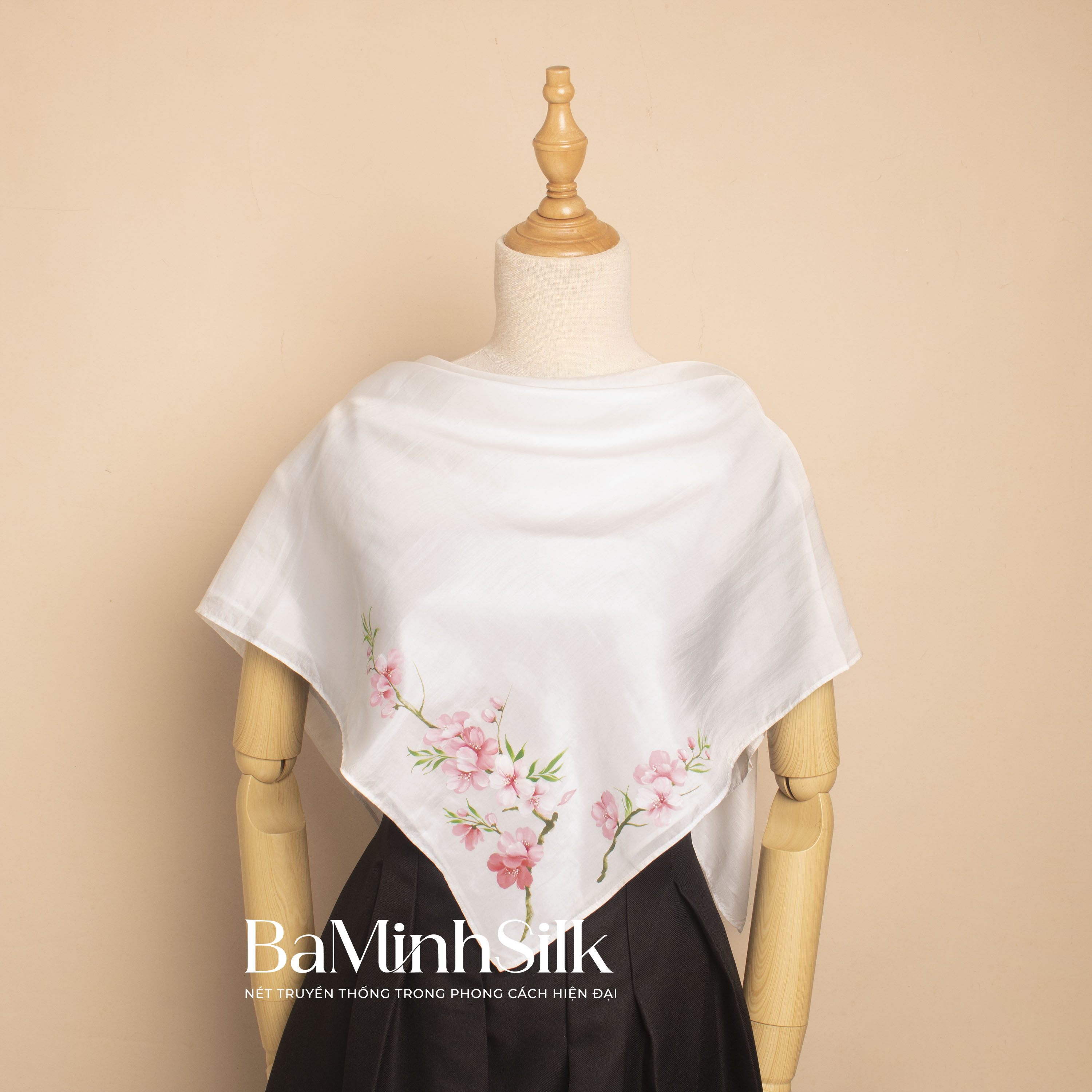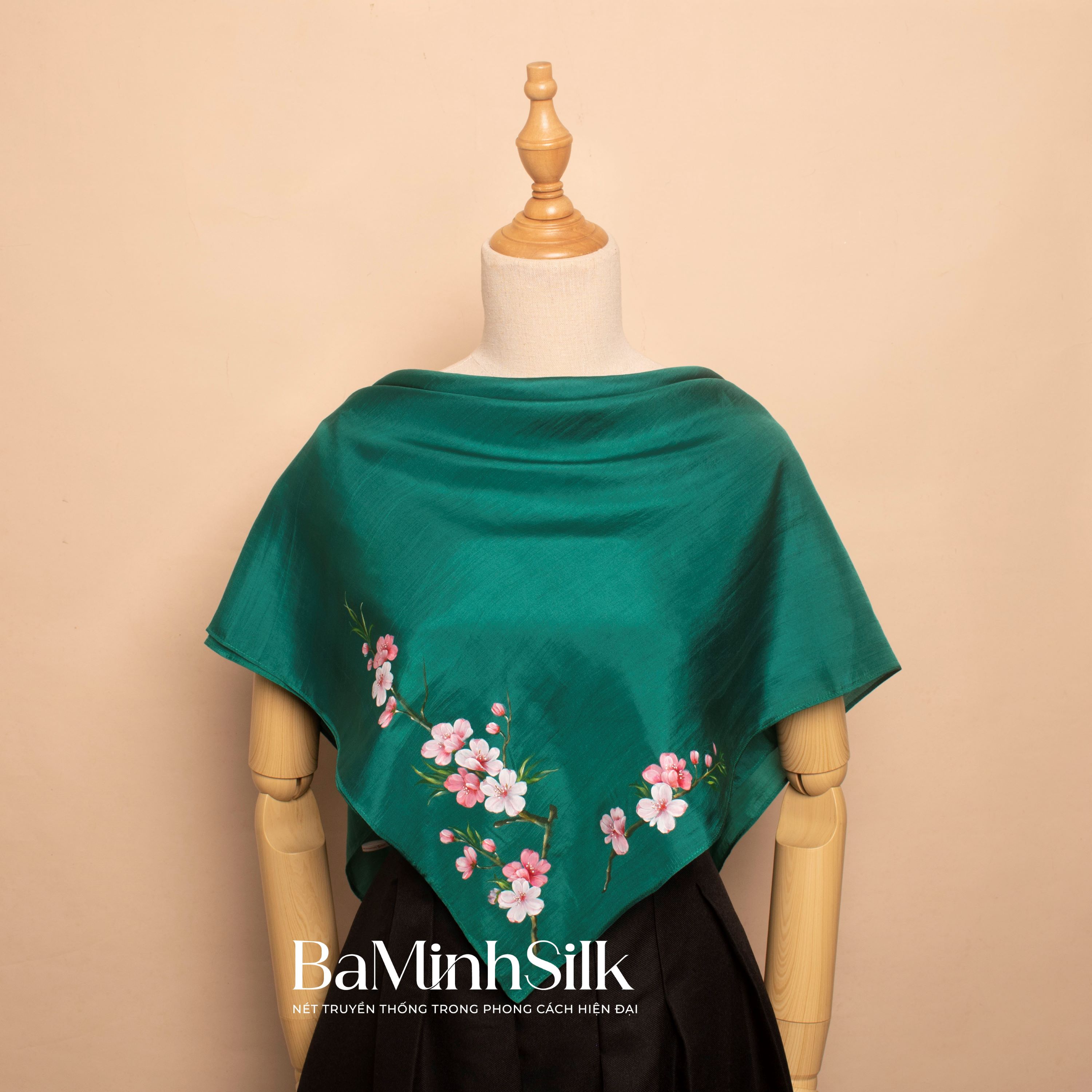 Khăn lụa tơ tằm mềm óng, sang trọng khi kết hợp cùng họa tiết hoa đào vẽ tay tinh tế, tạo nên phụ kiện vừa cao cấp vừa mang đậm bản sắc văn hóa Việt. Khăn có thể sử dụng linh hoạt: choàng nhẹ với váy dự tiệc hay áo dài; quàng với trang phục công sở, là khăn bandana hay trang trí túi xách.