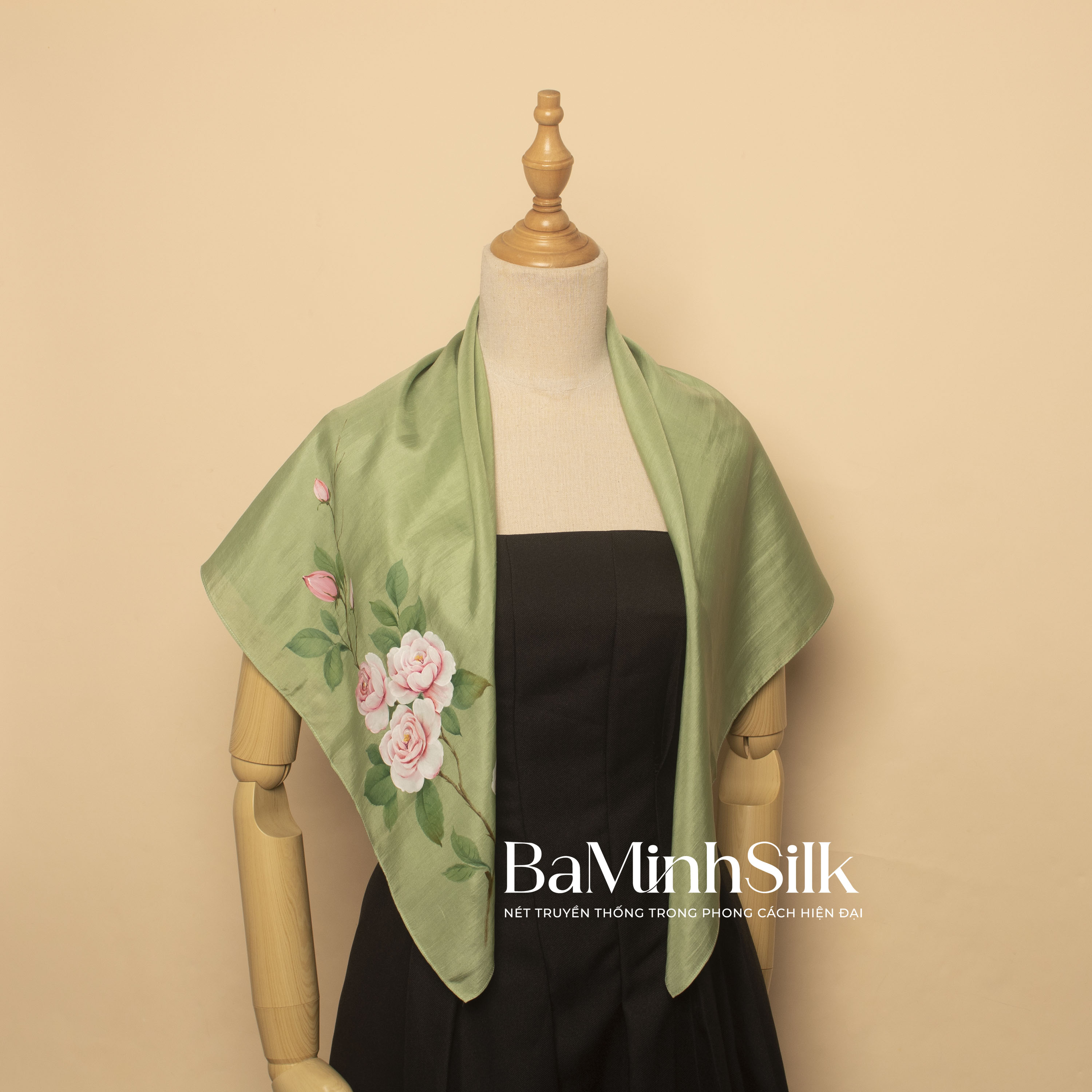 Khăn lụa vuông Hoa Hồng vẽ tay của Bá Minh Silk, được dệt thủ công từ chất liệu tơ tằm tự nhiên tại làng lụa Nha Xá (Duy Tiên, Hà Nam) có lịch sử hơn 700 năm. Sau đó, khăn được vẽ tay hoàn toàn bởi những đôi tay tài hoa của họa sĩ Việt Nam.