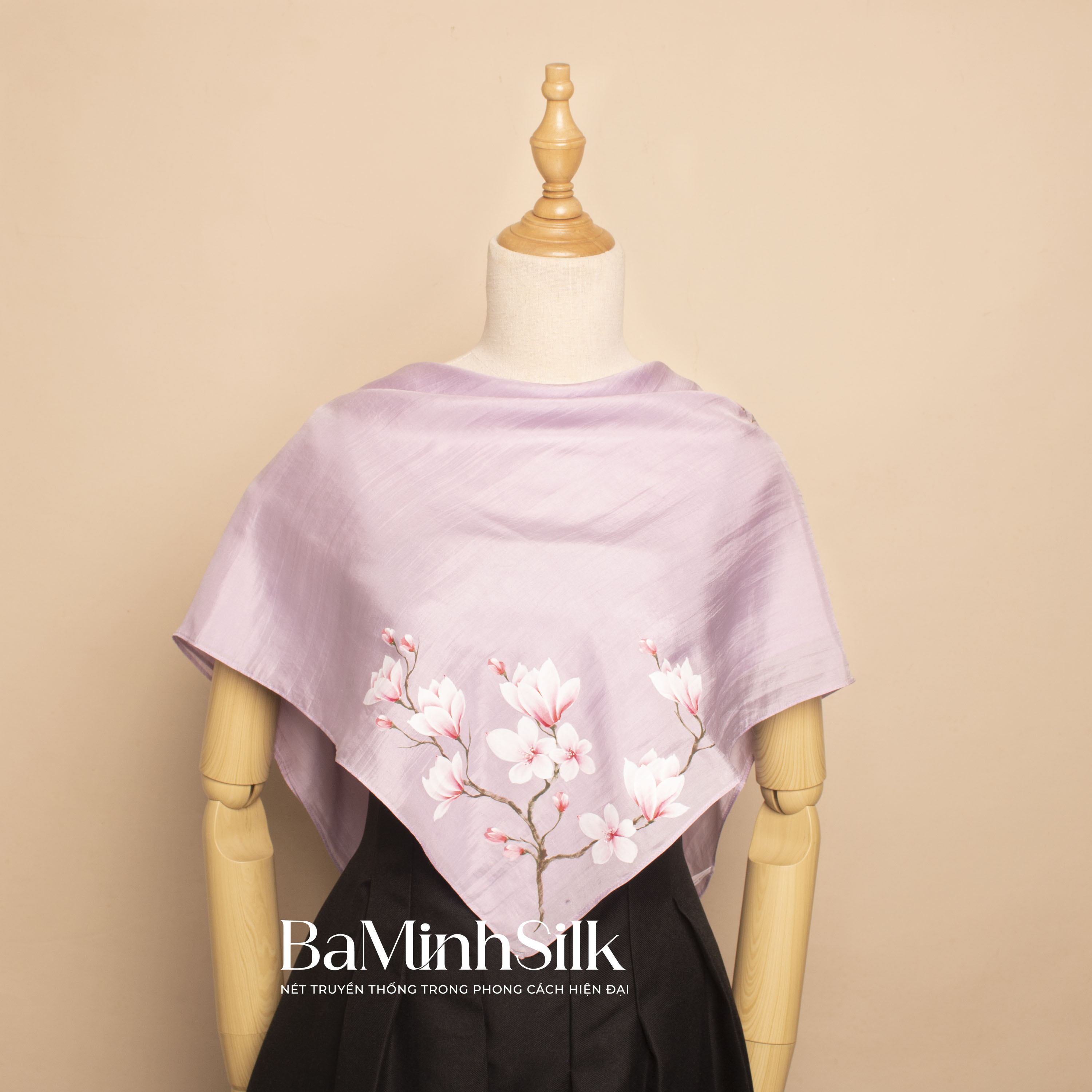 Khăn lụa tơ tằm mềm óng, sang trọng khi kết hợp cùng họa tiết hoa mộc lan vẽ tay tinh tế, tạo nên phụ kiện vừa cao cấp vừa mang đậm bản sắc văn hóa Việt. Khăn có thể sử dụng linh hoạt: choàng nhẹ với váy dự tiệc hay áo dài; quàng với trang phục công sở, là khăn bandana hay trang trí túi xách.