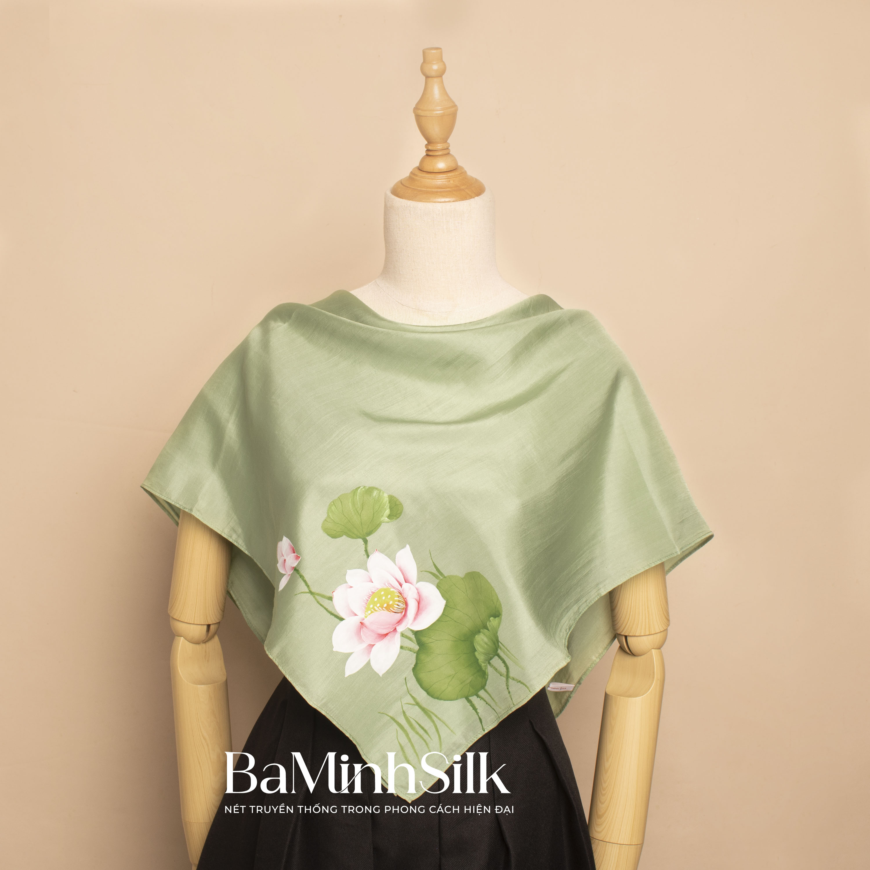 Khăn lụa tơ tằm mềm óng, sang trọng khi kết hợp cùng họa tiết hoa sen vẽ tay tinh tế, tạo nên phụ kiện vừa cao cấp vừa mang đậm bản sắc văn hóa Việt. Khăn có thể sử dụng linh hoạt: choàng nhẹ với váy dự tiệc hay áo dài; quàng với trang phục công sở, là khăn bandana hay trang trí túi xách.