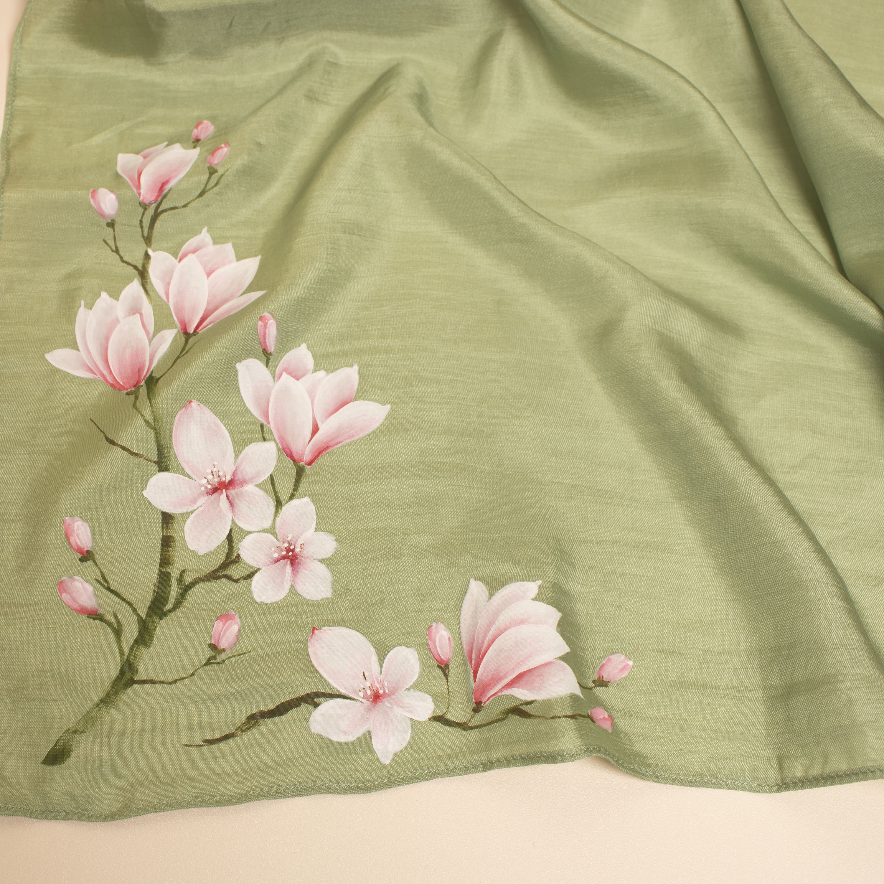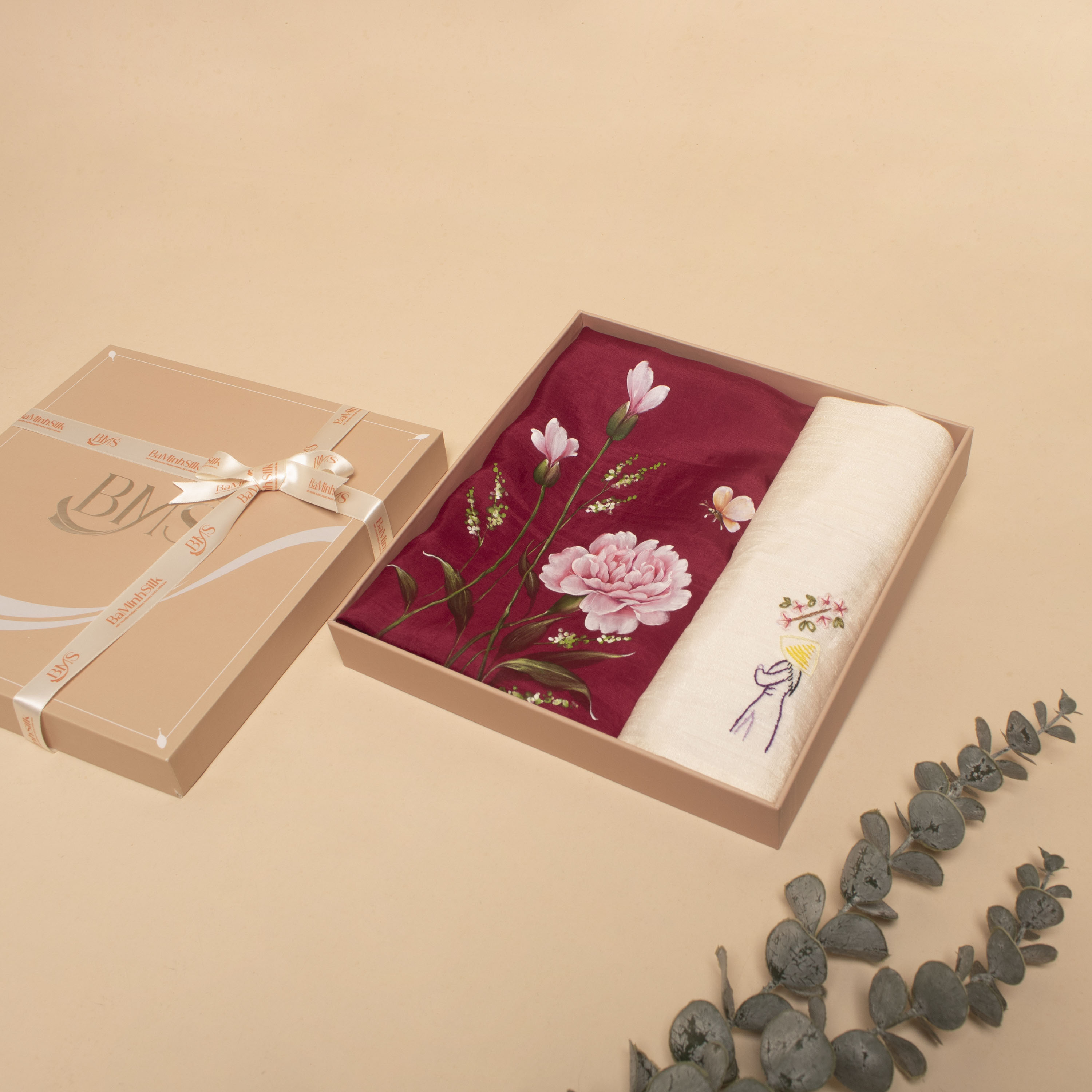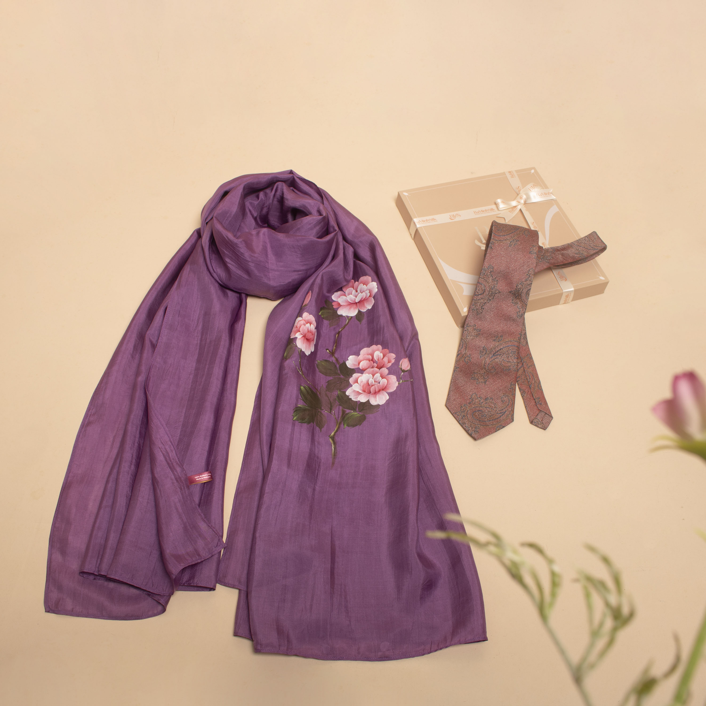 Khăn choàng lụa tơ tằm vẽ hoa mẫu đơn: Dệt tại làng lụa Nha Xá (Hà Nam) – làng nghề hơn 700 năm tuổi, kết hợp họa tiết hoa mẫu đơn vẽ tay, biểu tượng của phú quý, vinh hoa và hạnh phúc.